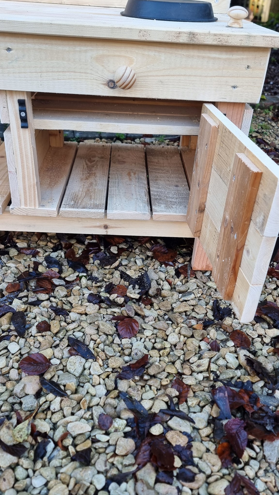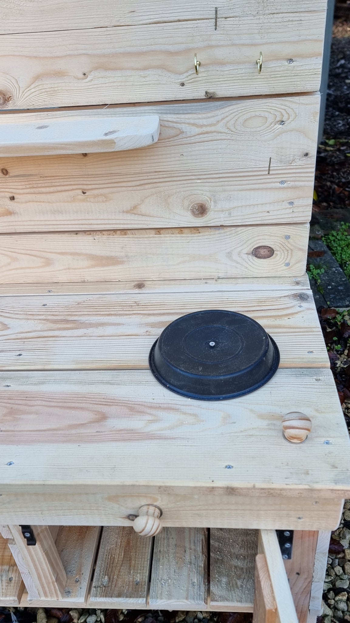Mud Kitchen, with a ‘hob’ and control button, stainless steel bowl sink with character salvaged tap (all styles will vary), Oven with grill shelf, top shelf, bottom tray. 2 side hooks.